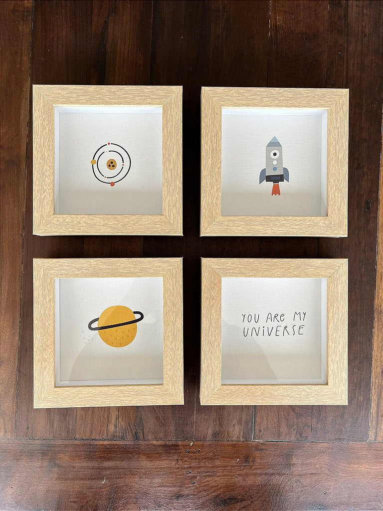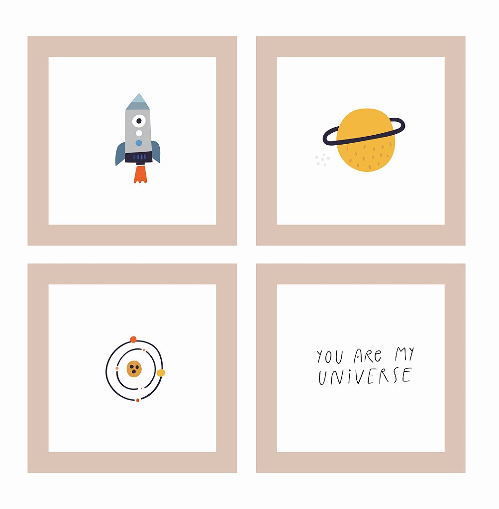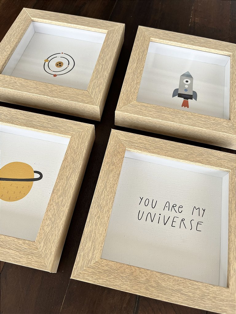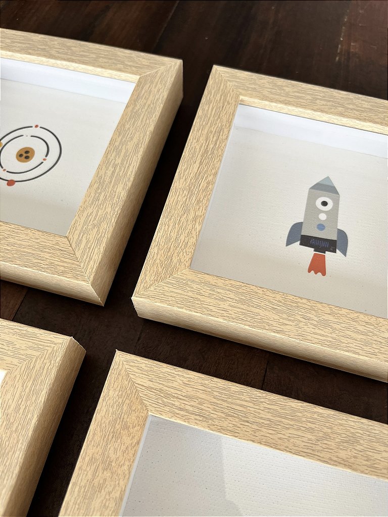 - Kit com 4 quadros decorativos com ilustrações exclusivas de temática espacial