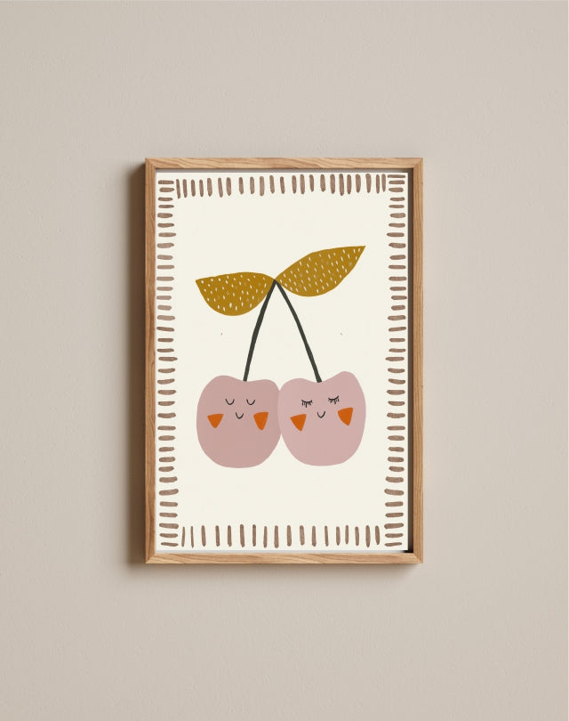 A arte das cerejinhas transmite leveza e alegria, ideal para decorações com temas como “Frutinhas”, “Natureza” ou “Primavera”. Seus tons delicados harmonizam com paletas neutras ou coloridas, combinando perfeitamente com quartinhos modernos, clássicos ou montessorianos.