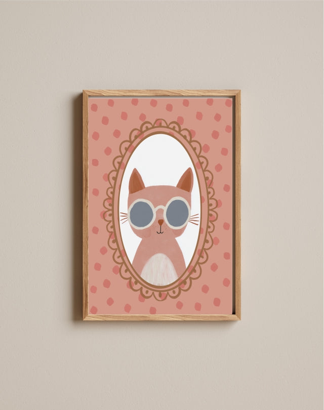A arte, feita em aquarela delicada, apresenta um gatinho simpático com óculos estilosos, transmitindo leveza e alegria. Ideal para quem ama temas modernos e divertidos, o quadro combina facilmente com diferentes estilos de decoração infantil — do boho clean ao escandinavo, trazendo cor e identidade ao ambiente.
