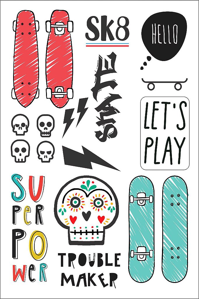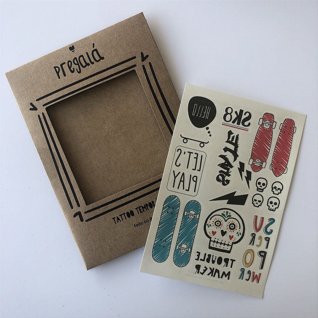 As Tatuagens Temporárias SK8 são perfeitas para quem ama o universo do skate! Com ilustrações exclusivas cheias de estilo — skates, caveiras, raios e grafites — elas trazem atitude e diversão para pequenos e grandinhos.